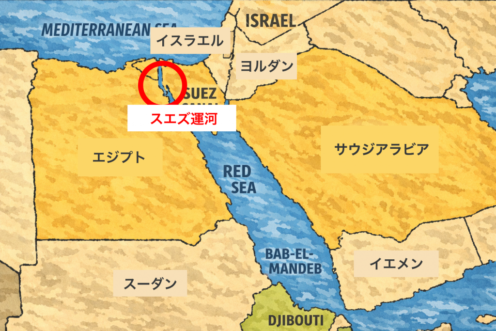一方で、アラビア半島を挟んでホルムズ海峡の反対側にスエズ運河というボトルネックが存在しています。